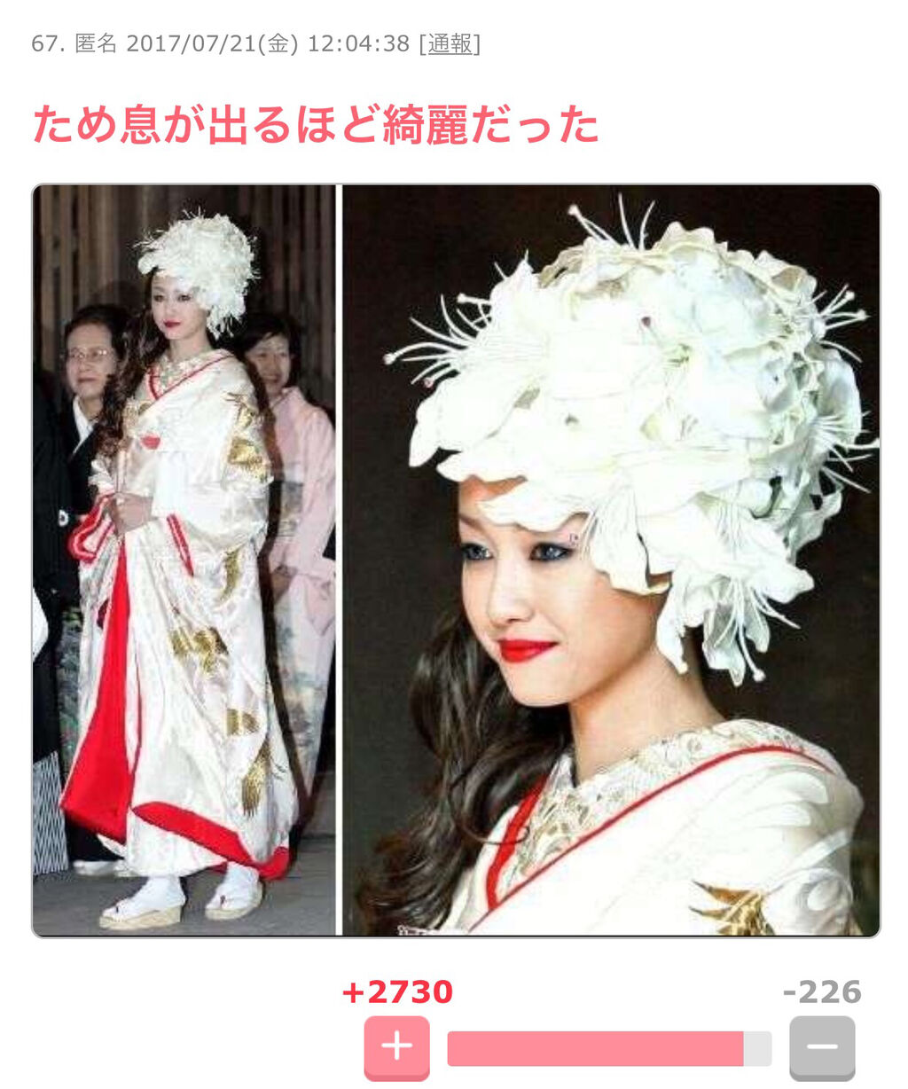 74 名無しさん@涙目です。(SB-iPhone)@\(^o^)/ [JP] :2017/07/22(土) 16:30:40.99 ID:VkW6PS/m0.netよく知らんけど白無垢なのに色柄とわこれいかに